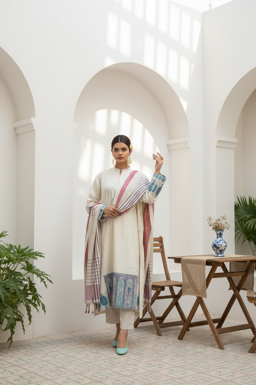 I am a pair of Shirt, Dupatta and Trouser Hand-woven by the master and rare artisans of Pakistan.